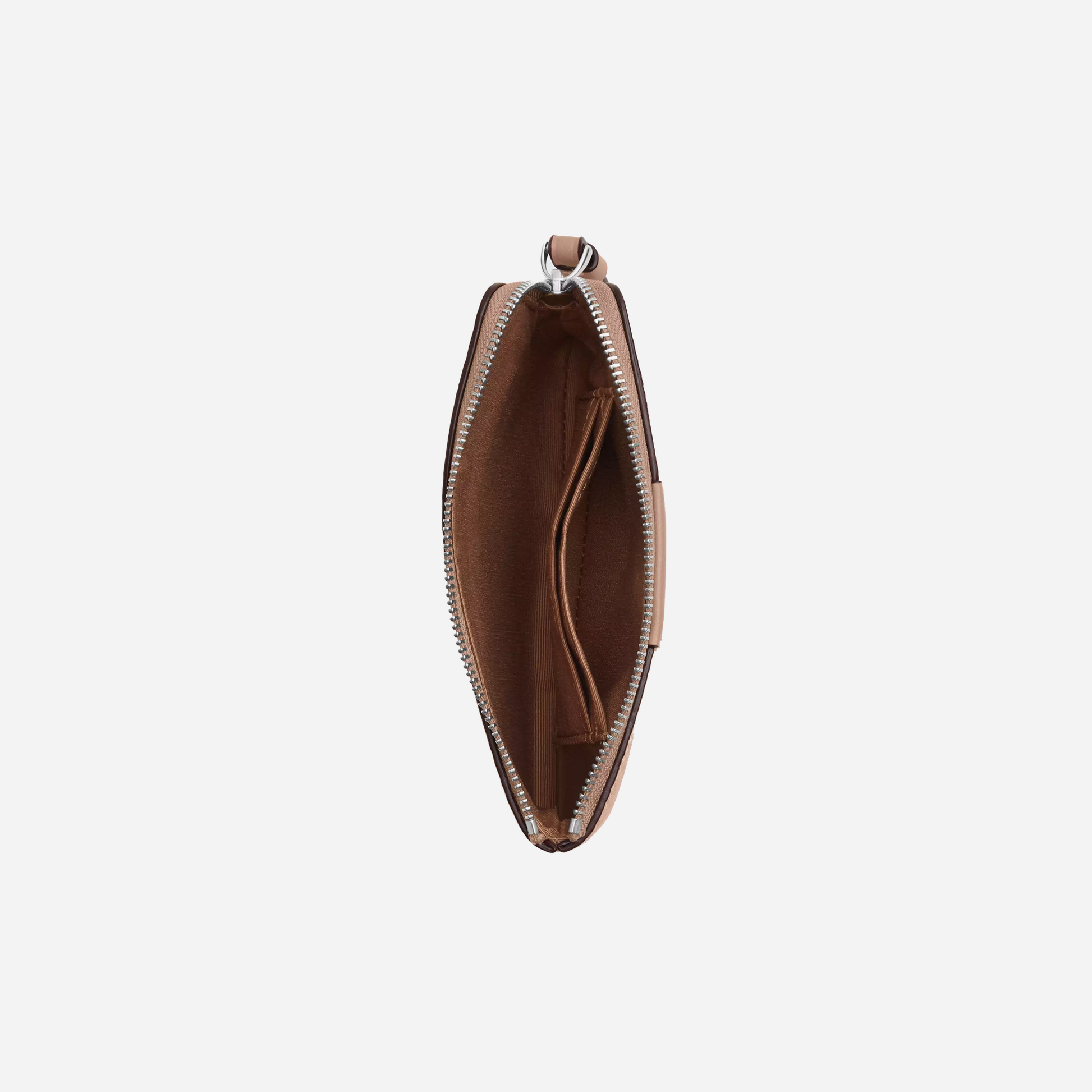 The Coach Corner Zip Wristlet in Signature Canvas features the iconic monogram pattern with refined leather accents a secure zip closure and wrist strap perfect for carrying essentials in compact stylish form every day.