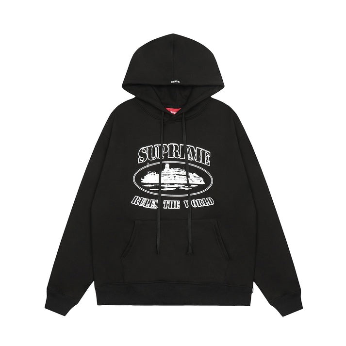 - The front features a durable print with the Supreme logo and the text "Rule The World" in contrasting color, as well as an iconic ship motif that creates a bold, urban style.