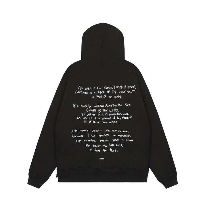 - The back is printed with a meaningful quote , including John Donne's "No man is an island", which gives the garment a deeper message and an artistic touch.